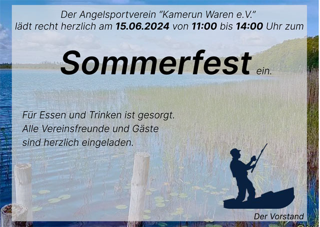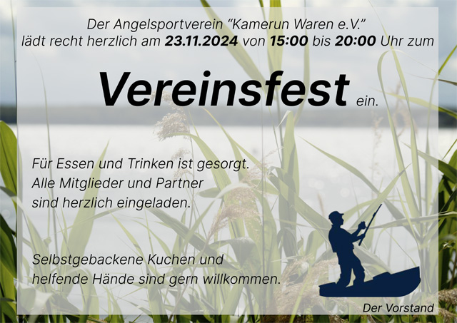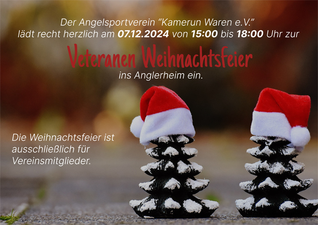 Der Angelsportverein “Kamerun Waren e.V.” lädt recht herzlich am 07.12.2024 von 15:00 bis 18:00 Uhr zur Veteranen Weihnachtsfeier ins Anglerheim ein. -