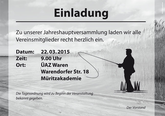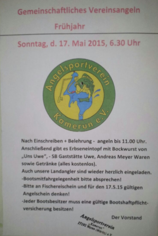 - Für die einen endet gerade die Bootssaison, für andere steht die neue unmittelbar bevor. Der Angelsportverein Kamerun Waren (Müritz) e.V. hat für 2016 wieder fünf freie Außenliegerplätze. Die Größe der Stände beträgt max. 7,00 m x 2,85 m.