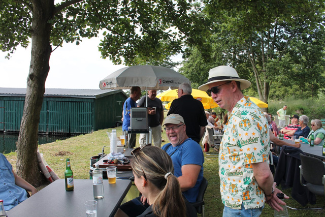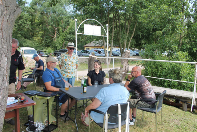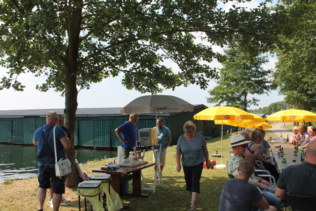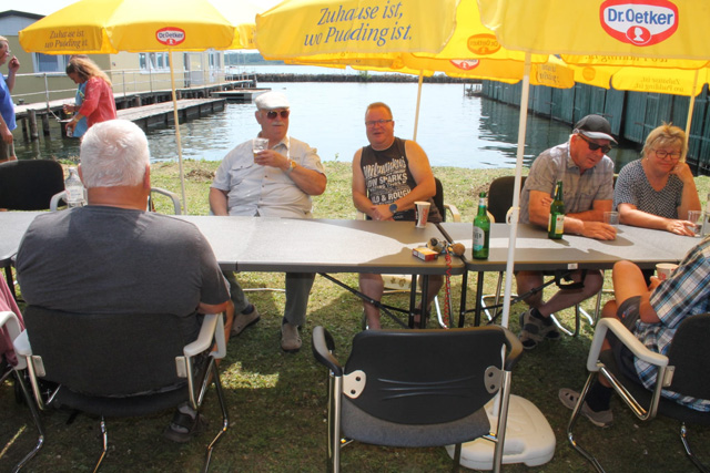 Gegen einen Obolus konnte man an einer Vertrauenskasse zusätzliche Getränke, darunter Wein und kleine Spirituosen, erhalten.Bei leiser Hintergrund Musik ergaben sich immer wieder nette Gespräche, es wurden Erfahrungen zum Thema Angeln und Wassersport untereinander ausgetauscht.